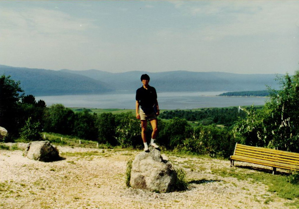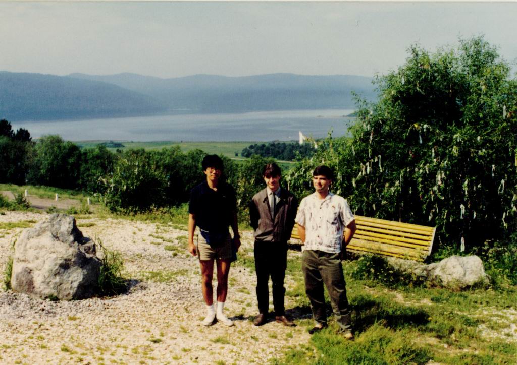リストビャンカに着く前、バイカル湖を見渡す展望台にバスが停車した。バイカル湖を背景に横浜からずーと同じ旅程のフランス人教師たちと写真を撮った。背景がバイカル湖だが海のようにも見える大きさだけは実感した。生憎この日は雲が多かった、服装は非常に軽装である。この程度でもぎりぎり重ね着するするまでには至らなかったが、一瞬で天気が変わるのでズボンと上着が望ましい。