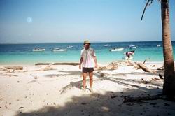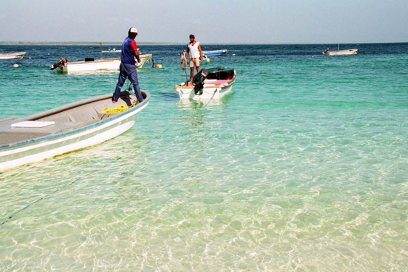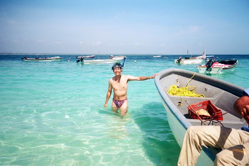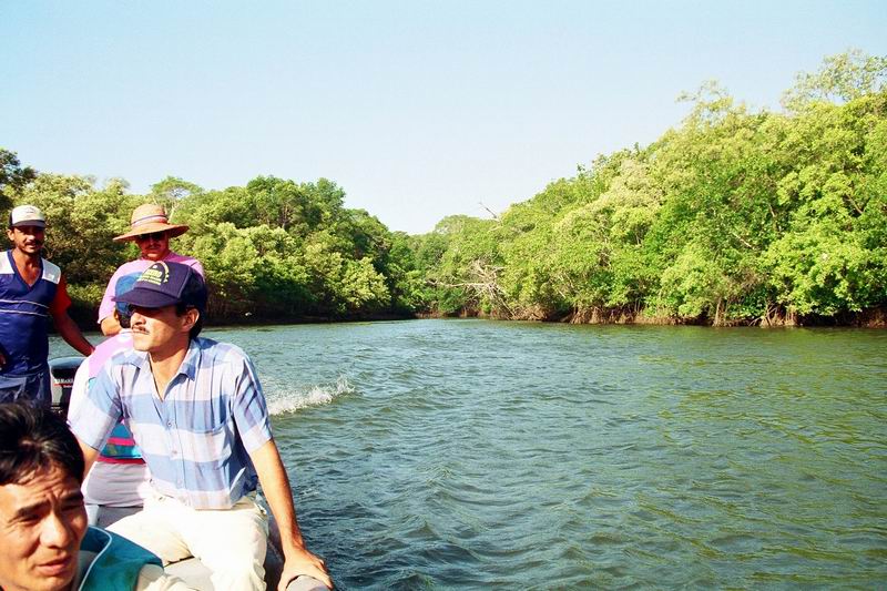ペダシでギターの生演奏付き(自前)海鮮料理を楽しんだ翌日、小さな漁船をチャーターしてペダシ沖合いに浮かぶ野生生物保護区に指定されているイグアナ島を踏査した。町の外れ、やたら大きなマングローブに囲まれたクリークから3隻のボートに分乗する。静かにマングローブ林の中を走り出す。外洋へ出たとたんに波が高くなり、グラスファイバーの軽い船はひっくり返るのではと思うほど木の葉のようにうねりに左右された。 何度も何度もひっくり返りそうになりながら波に合わせて体重を前に移動することを繰り返しているうちにイグアナ島の島陰に入ることができた。持参したカメラが心配だったが、海水がかからないようにビニル袋に入れ、ディパックを舳先に近いところへ置いておいたので無事だった。 左の写真は、イグアナ島へ着いてから撮影したものであるが、服がぐちゃぐちゃになっている様子は海の荒れ具合を物語っている。このとき、先に出た我々のボートだけがイグアナ島に着き、他の2隻は一旦引き返し、その後、波が落ち着いてからそのうちの1隻が再度挑戦しやってきた。 ![]() |