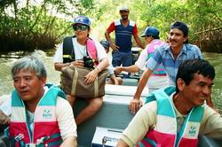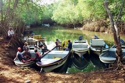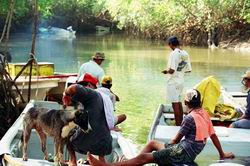 出発の様子(ペダシの港、マングローブ林のなか)これから何が起こるのか?何の不安もなくクリークの港を出港した面々。