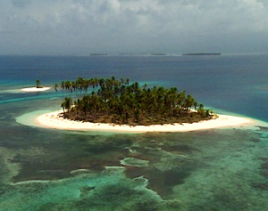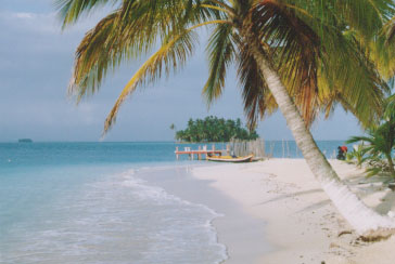 | 【セスナに乗ってクナヤラヘ】 パナマ市内にあるプンタ・パイティージャの空港からセスナに乗って1時間あまり、パナマ地峡の高い山を越えればそこはクナ族の住む地サンブラス、ジャングルを切り開いた海岸にある空港にセスナ特有の横風に弱い脆弱な印象でフラフラと着陸する。 空港の端に桟橋があり、そこにはボートが既に待っていた。宿からの迎えでだ。4人も乗ったら転覆しそうなボートでクナ族の住む島々を横目に見ながら、珊瑚礁に囲まれたホテルのある島に着く。ホテルといっても椰子の葉で葺いたカバニャと呼ぶ小屋だ。この島にはこの一軒のカバニャがあるだけ。このようなカバニャが4−5棟(2-3人用)、そしてこのカバーニャ用のレストラン(食堂)だけだ。 カバーニャの床はもちろん白い砂。ここでは靴は必要ない。上の写真そのまま。飲料水は雨水、トイレの水洗も雨水。電気はない。が明かりと冷蔵庫はあった。ガス灯とガスを使った冷蔵庫だ。月が出ていれば結構明るい。 ここでのディナーは当然海の幸、カニと大きな貝のチャーハンのようなものを食べた記憶。貝殻は料理をした後海に漬けておく。そうすると微生物が貝殻の中まで綺麗に掃除してくれるのだ。この貝殻はカバナスのオーナーに頼んで持ち帰った。 ![]() (借り物写真) |