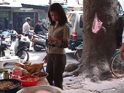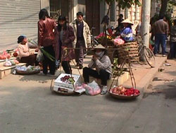 今日のお昼ははベトソバの”フォー”にしようと連れだって事務所から歩いて数分の食堂街へ行く。事務所を出たとこにはいつものように行商のおばさんたちが果物を並べている。 Feb.3, 2000 |