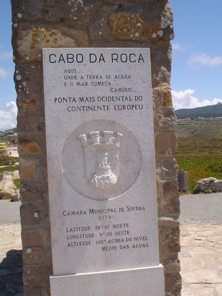 バスに乗ってユーラシア大陸最西端のロカ岬へ行った。切り立った崖の上に灯台がありその先にポルトガルの詩人ルイス・デ・カモンイスの叙事詩「ウズ・ルジアダス」第3詩20節の一節「ここに地終わり海始まる(Onde a terra acaba e o mar comeca)」を刻んだ石碑が立っている。岬はの位置は、北緯38度47分、西経9度30分だ。岬からは荒波の大西洋が広がっていた。(オリジナル写真を捜索中なので、下の写真はwikiからの借り物)