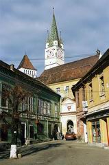 1999年12月、シギショアラからシビウへ向う途中に立ち寄った。ここは運転手のジョージが暮らした町でよく知っていることと知り合いに顔をみせたいというので立ち寄った。 街の中心に近い、マーケットにの隣に車を止めそこから歩いた。大きな街ではないので直ぐに歩けてしまうのだが、街の中心には広場があり、その近くに尖塔を持った教会が青空に突き出ていた。 |