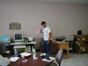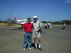 コスタリカの太平洋側、ニコヤ半島の観光地、タマリンドからオサ半島へ向けての空からの現地踏査のため、チャーターフライトを待っているところ。その間、小型機がひっきりなしに発着。その前でCPのアントニオとポーズ。利用客はほとんどが外国人。空港施設は滑走路とシェルターがあるのみ。その他は木陰に随時開設されるチェックインカウンター(プラスチックの台)のみ。非常にローカルな空港イメージ。でも十機能している。