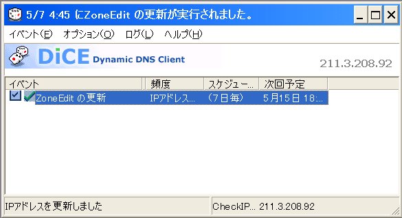 ダウンロードサイト:http://www.hi-ho.ne.jp/yoshihiro_e/dice/ 《ワイルドカード使用によるDynSiteがIPを自動更新してくれない場合の対応》 *.mauri.org.ukとした場合、”詳細”でオプションの更新モードが”ゾーン”(規定値)になっているとIPが更新されない。これを”ホスト”へ変更する。そうしないとIPが自動更新されない。 起動画面(既に設定済みだが、設定前はイベントが無い状態となる。