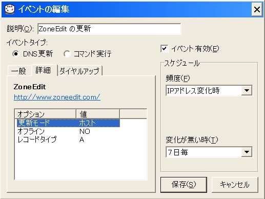 メニューからイベント、追加で下の画面が表示される。 一般/ サービス名:プルダウンメニューから選択、 ホスト名:サブドメインがあれば、”*"を入れておく。 ドメイン名:独自ドメイン名 ユーザ名: ZoneEditで登録したユーザ名 パスワードを入力:ZoneEditで登録したパスワード イベント有効:クリック スケジュール/ 頻度:”IPアドレス変化時”を選択 変化が無いとき:”7日毎”を選択