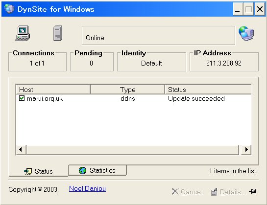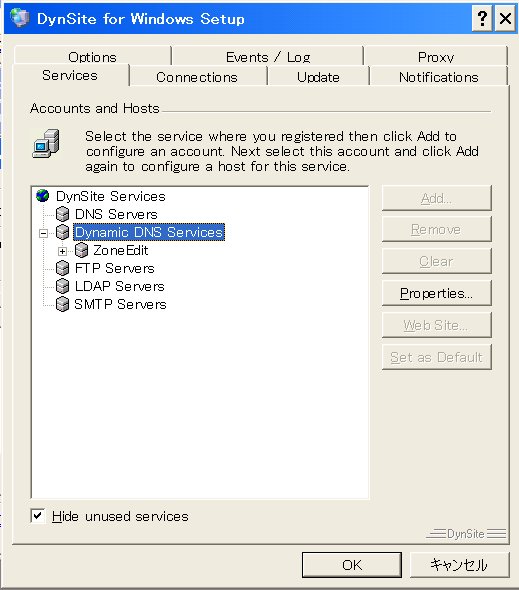 1.DynSite for Windows Ver.1.1 Hammernodeのwebでこの自動更新ソフトが紹介されていたので使い始めた。 上記サイトからアプリケーションをダウンロード、インストールする タスクバーにアイコンが表示されるので、右クリック、"Setup"を選択、ダイアログボックスが表示、これが設定画面となる。 ウィザードがあり自動でも設定ができるようだ。 "Dynamic DNS Service"を選択、”Add”ボタンをクリック