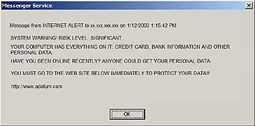 3)Zone Alarmのインストール ここではZoneAlarmのインストールを紹介します。 □ダウンロード先 □インストール □設定 4)セキュリティの確認サイト(自分のPCポートをスキャンする) 2サイトとも米語サイトですが、要は ■米GibsonSerch社が提供する「Shields Up!」 http://grc.com/x/ne.dll?bh0bkyd2 ■Sygate Online Services http://scan.sygatetech.com/ 5)その他の対策など ■ルーターの導入 ブロードバンドモデムと自分のマシンの間にセキュリティー機能の付いた「ルーター」を導入し、更なる安全を目指してみよう。 今回のシステム環境ではPCが1台なのでルーターは使っていないが、日本ではルーターを導入している。 ■pop-up ads対策 インターネットに繋いでいるだけで下記のような”メッセージサービス”というポップアップ広告が表示されることがある。最初にこのポップアップが表示されたのは、英国のフリーISPを使い始めたときであり、そのISPサイトには無料ファイアーウォールをインストールすることにより問題が解決されると説明されていた。そして、実際にこの問題は解決された。それが、ZoneAlarmだった。 しかし、昨日(2003年8月29日)からまたポップアップ広告が頻繁に表示されるようになった。これはwww.byebyeads.comからで、そのポップアップ広告を止めるアプリケーションの広告である。マイクロソフトのサイトにあった下記の対策を施すことにより、ポップアップメッセージは一応解決された。 Firewallをインストールしていても、このようなメッセージ広告が表示されるのはどうしたことか、これは持ち越しの課題となった。