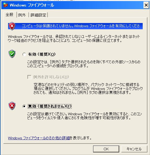 画面はファイアーウォールの設定が有効になっていないので、有効をクリックしておく。